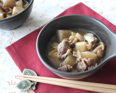 さといもが柔らかくなったら合わせ調味料としめじを加え、さらに10分煮る。牛肉と長ねぎを入れ、5分煮込む。器に盛り付ければ完成。