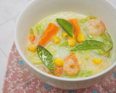 野菜のうまみを吸ったはるさめと、牛乳を使ったまろやかなスープが美味しいちゃんぽん風はるさめスープです。牛乳を使用することで、料理にコクが加わりわるので、塩分控えめでも満足感のある仕上がりになりますよ。