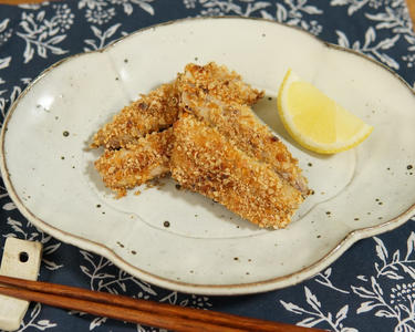 さんまは脂を多く含むため揚げ物にすると高カロリーに。そこで柿の種を砕いて衣にしてノンオイルで焼きました。衣がしっかりとさんまの脂を吸収して揚げ物のような香ばしくサクサク食感に!ぜひお試しください。