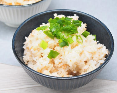 炊き終わったらご飯をざっくりと混ぜ、お茶碗に盛り付ける。 小ねぎをトッピングして完成。