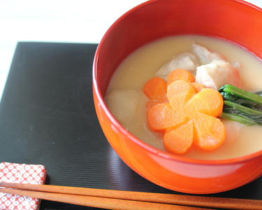白みそを使った関西風のお雑煮のレシピです。京都のお雑煮は大きな頭芋を使ったシンプルな白みそのお雑煮が定番ですが、栄養バランスを整えるために色鮮やかな野菜と、鶏肉を入れてアレンジしました。もちは関西で定番の丸もちを使います。白みそは甘みが強いので、お子様にも喜ばれる味となっていますよ♪