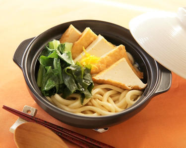 生揚げは骨粗鬆症予防に期待されるたんぱく質やカルシウムを豊富に含みます。油で揚げてあるためコクがあり立派なメイン食材のひとつです。緑黄色野菜のこまつなを添えればさらに栄養素のバランスアップ!鍋焼きうどんにすれば洗い物も減り時短にもなります。