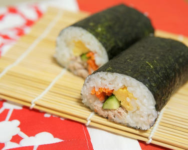 まきすの上にのりを横長におき、手に酢を適量つけて酢飯をのりの上にのせ、奥を2cmほどあけて酢飯を全体に広げる。厚焼き玉子、きゅうり、にんじん、ツナマヨをのせる。