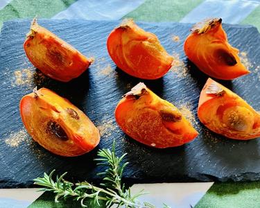 熟したかきをじっくり加熱すると、とろとろ温かいスイーツに変身します。自然な果物の極上の甘みにシナモンでアクセントをつけていただきましょう。焼き目の香ばしさが上品です。緑茶や珈琲にも合いますよ。ひとり2切です。