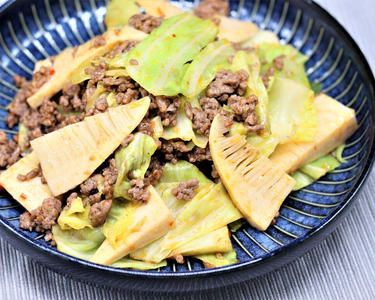 フライパンに合いびき肉を入れて中火にかけ、色が変わるまで炒める。 さらに1のキャベツを加えてしんなりするまで炒め、たけのこを加えてザッと炒め合わせる。