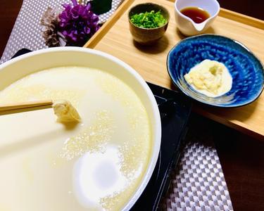 出来立てのとろりとした汲み上げ湯葉は格別の味。湯葉が出来るまでの時間もごちそうに、週末のディナーにいかがでしょうか。お子様も自分で作ると大喜びです。大豆には女性に嬉しいイソフラボンが含まれています。お好みで一味やすだちの皮を添えてもいいでしょう。