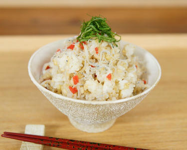 ちりめんじゃこはいわしの稚魚を天日などで乾燥させたものです。じゃこやごまはカルシウムを豊富に含むため骨粗鬆症予防に役立ちます。たっぷりのすりごまに梅やしそを加えることで香りの良い混ぜご飯に仕上げました。