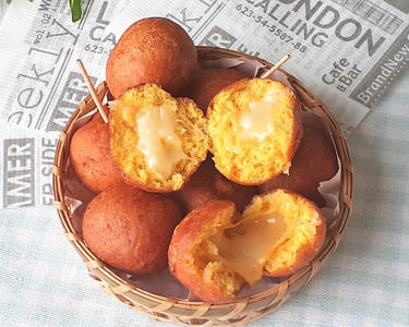 中からチーズがとろけるドーナツです。かぼちゃに含まれるβ-カロテンは皮膚や粘膜の健康を維持する働きがあり、ビタミンEは血行を良くするので、美肌のためにも嬉しいおやつです。チーズの塩気がかぼちゃの自然な甘みを引き立てます。