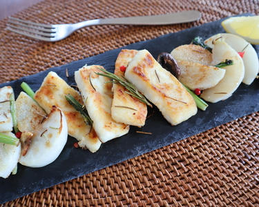 フライパンにオリーブ油を入れ、にんにくとローズマリーを炒めて香りを出す。ひらめ、かぶ、かぶの葉、ながいも、マッシュルームを入れて、塩を少々ふり入れる。表面がきつね色になるまで焼く。
