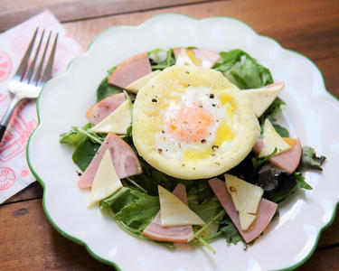皿にベビーリーフを盛り、2のハムとチーズを周りに飾る。真ん中に5のポテトエッグをのせ、上からオリーブ油をかけ、塩と黒こしょうをふる。