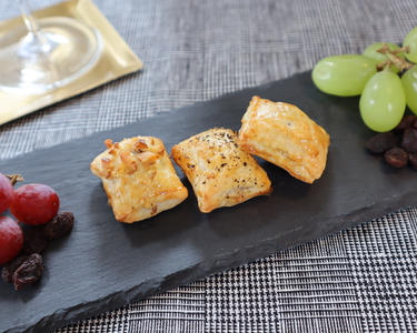 1のパイシート3枚の片側半分に、チョコレートとくるみ、チョコレートとレーズン、チョコレートとブラックペッパーをそれぞれのせる。二つ折りにし、まわりを指で押さえる。