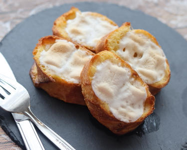 一旦、オーブンから天板を取り出す。 バゲット1切れにつき、マシュマロを2個ずつトッピングし、更にオーブンで3分ほど焼く。