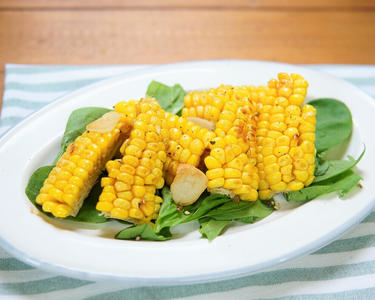 今が旬のとうもろこしににんにくとバターの香りがたまらない!軸をつけたまま調理しますので、かぶりつけて食べやすいです。とうもろこしの黄色とほうれん草の緑が、食卓に彩りを添えます。