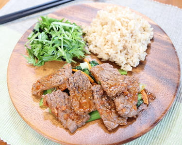 お皿の真ん中に小松菜のソテーをのせ、その上に牛肉のソテーをのせてタレとブラックペッパーをかける。玄米ごはんと水菜のナムルを横にのせる。