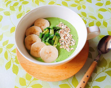 2がトロッとするまで攪拌したら器に注ぎ、1で用意したトッピング用の小松菜とバナナ、2で残したオートミールを飾る。