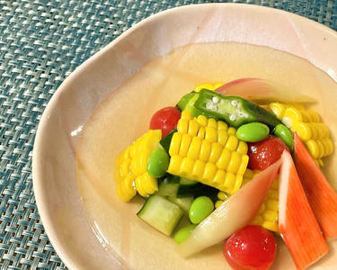 とうもろこしの芯からとった出汁をゼリーにした、夏に嬉しい涼やかな副菜です。彩り野菜が献立を華やかにしてくれるので、イベントやおもてなしにもおすすめの一品です。