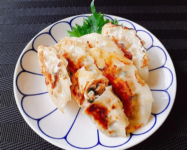 ごま油をひいたフライパンを熱して、そこに3の餃子を並べ(餃子の底に油を付けるように)、焼き色がついたら水を加え、蓋をして中火で水分がなくなるまで蒸し焼きにする。