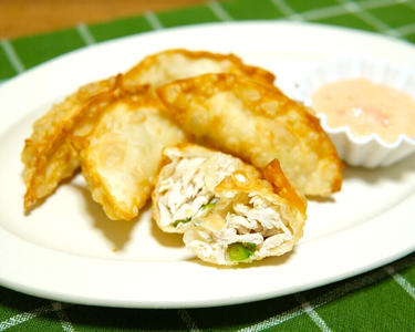 3を餃子の皮で包む。170度の油できつね色になるまで揚げる。