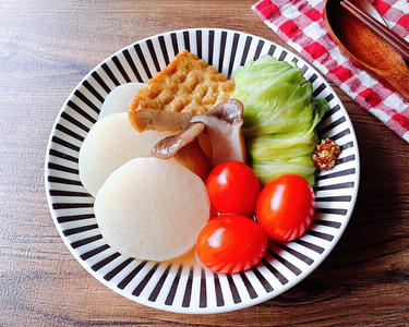 鍋に水と白ワイン、顆粒コンソメ、2の大根を入れて中火で加熱する。ひと煮立ちしたら弱火にして1のロールキャベツ、3のエリンギと厚揚げを加えて10分ほど煮る。 塩、こしょうで味を調えて、ミニトマトも入れてサッと煮たら火を止める。