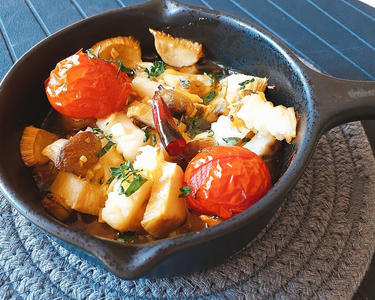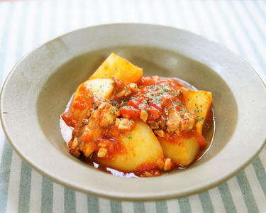にんにくが効いてる!さば缶とじゃが芋のトマト煮込み